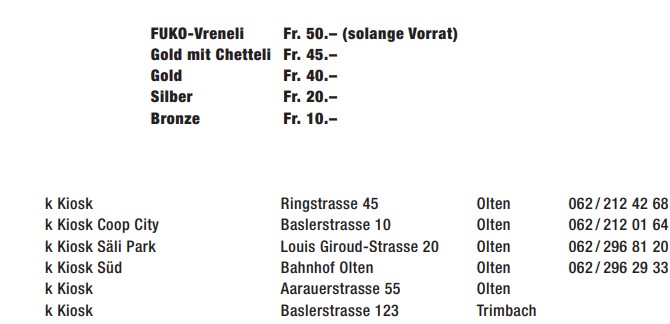 Die Plaketten sind bei allen Oltner Zünften und Cliquen wie auch bei folgenden Kiosk erhältlich. Wichtig: Alle untenstehenden Plaketten sind berechtig, gratis mit dem Bus an den Umzug und zurück zu fahren. |